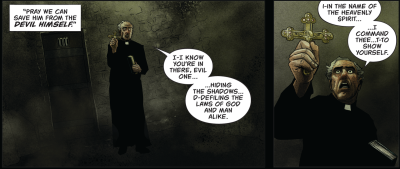 In the first few pages we meet renowned exorcist Father Vieri, who has been sent on a secret mission to kick a powerful demon out of the body of a nobleman’s son. In a dungeon surrounded by the mutilated bodies of previous exorcists, Vieri attempts to save the boy’s immortal soul.